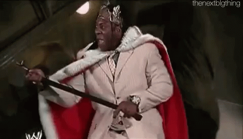 King Booker T makes a grand entrance, wearing a crown and cape, holding his scepter with regal flair.