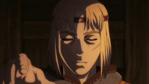 King Canute from Vinland Saga opens his eyes and gives a subtle, enigmatic smile in a dimly lit scene.