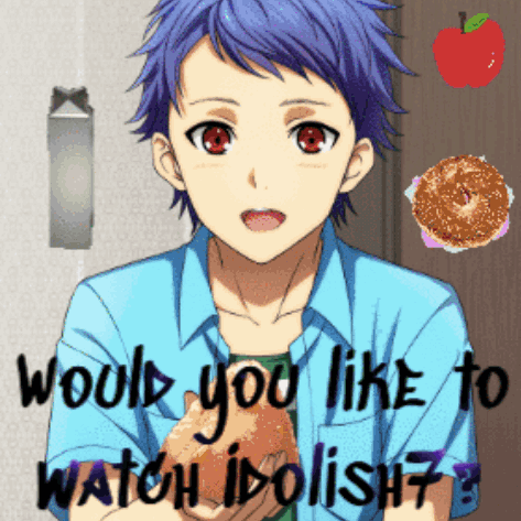 a boy with blue hair is holding a sandwich with the words would you like to watch idolish7