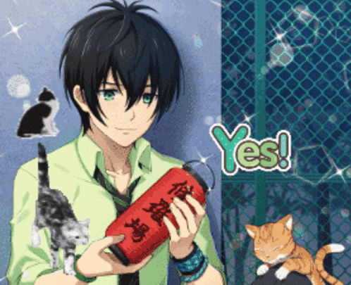 a boy in a green shirt and tie is holding a red lantern with chinese writing on it surrounded by cats and the word yes