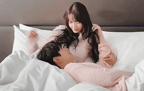 Lee Jun Ho and Lim Yoona as Gu Won and Cheon Sa-rang from King the Land, sharing a tender moment in bed.