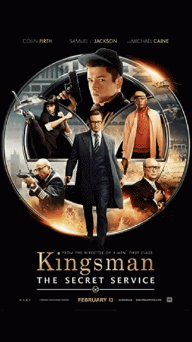 Official movie poster for Kingsman: The Secret Service, featuring a man in a suit within a circular emblem.