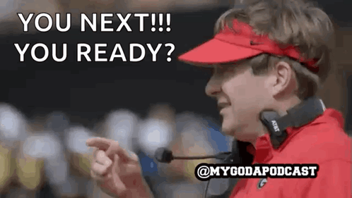 Kirby Smart, wearing a red visor and headphones, points and says 'YOU NEXT!!! YOU READY?' from My God A Podcast.