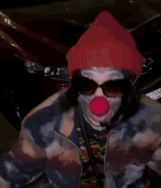 Person in a clown costume with a red nose, beanie, and sunglasses, moving their arms.