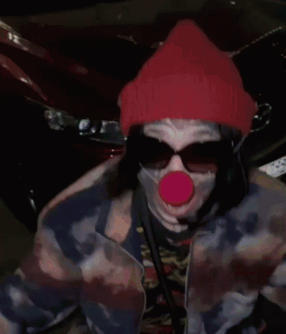 Person in a clown costume with a red hat, sunglasses, and red nose, making a gesture.