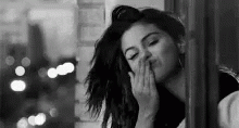 A woman in black and white blows a sweet kiss from a window, looking out into the night.