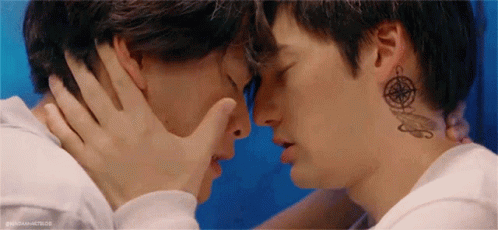 Two men share a sweet kiss, one with a compass and feather tattoo on his neck, in a tender moment.