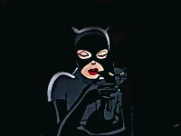 Catwoman blows a kiss while holding her black cat in a dark setting, showcasing the iconic character.