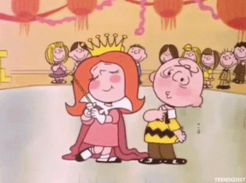 Charlie Brown shares a sweet kiss with the Little Red-Haired Girl, who wears a crown, in a charming animated scene.