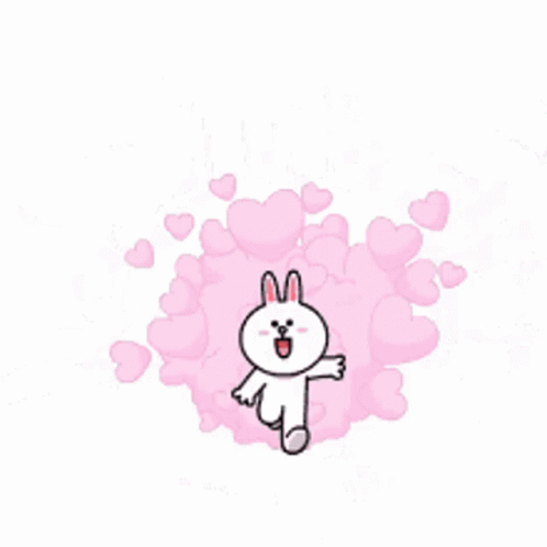 An adorable cartoon bunny with pink ears blows kisses, surrounded by floating red hearts and radiating love.