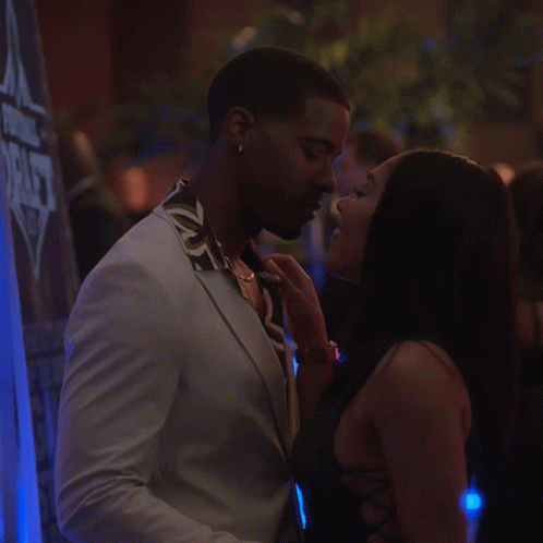 Brittany Pitts and Xavier Mitchell share a passionate kiss in a dimly lit room from The Game.