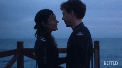 Nico and Lina share a tender kiss by the ocean, featuring Álvaro Cervantes and Nadia De Santiago.