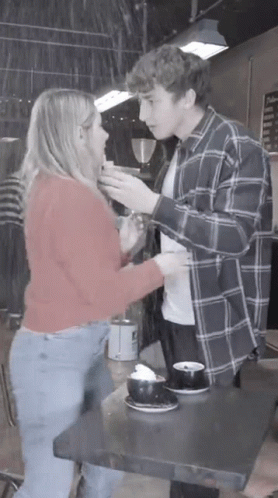 A couple shares a passionate kiss in a black and white scene, with artificial rain falling around them.