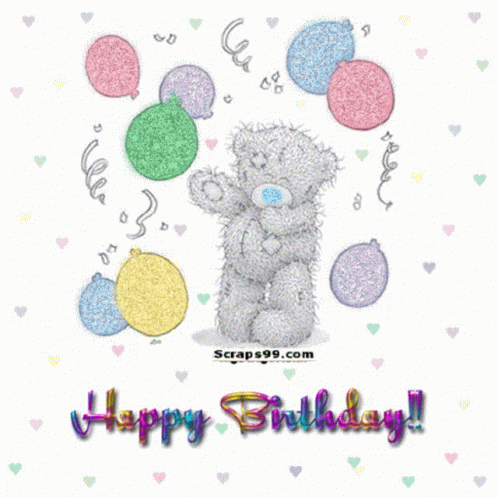 A cute teddy bear celebrates its happy birthday, surrounded by balloons and confetti.