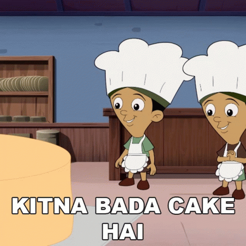 Bholu and Dholu from Chhota Bheem react to a giant cake, exclaiming 'Kitna Bada Cake Hai'.