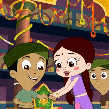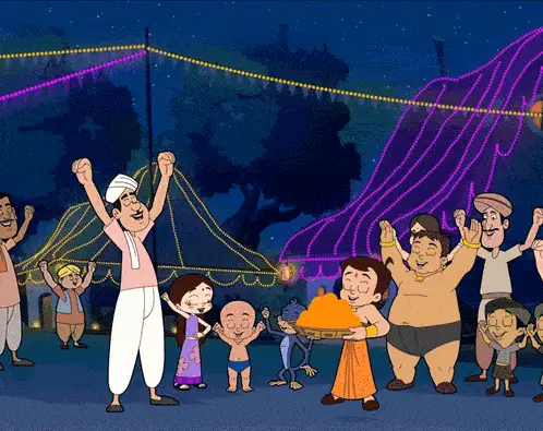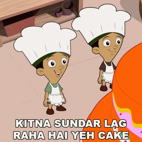 Bholu and Dholu, dressed as chefs, admire a beautiful cake, exclaiming 'Kitna Sundar Lag Raha Hai Yeh Cake!'