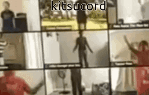 a group of people are dancing in front of a screen with the word kitsucord written above them
