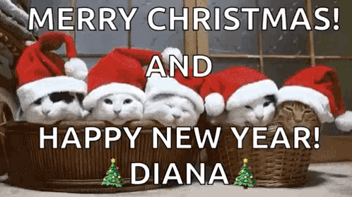 Adorable kitties in Santa hats wish Merry Christmas and Happy New Year, with a special greeting for Diana.