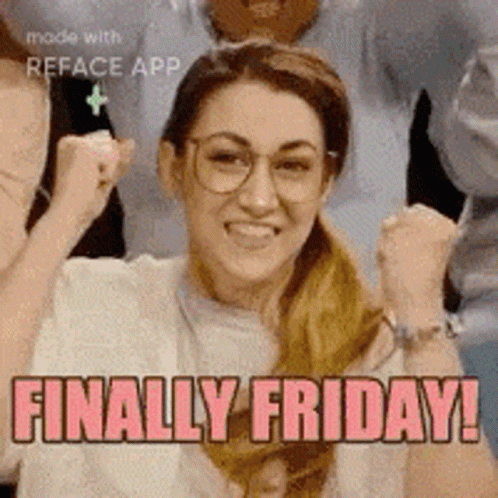 Kitttay, wearing glasses, excitedly celebrates the arrival of Friday with a cheerful expression.