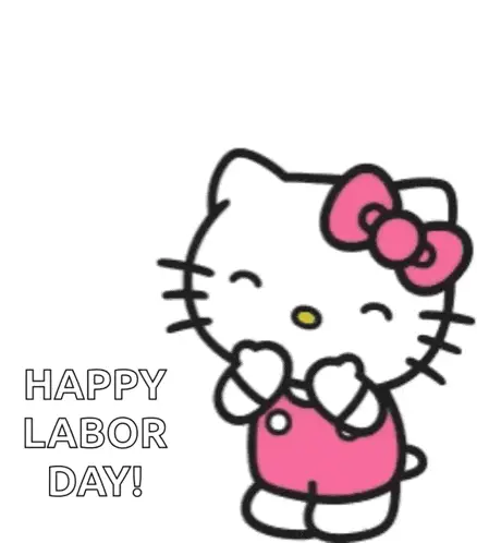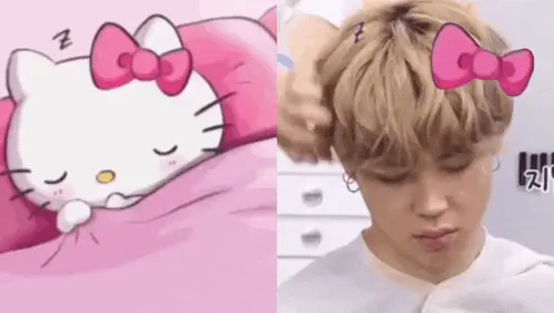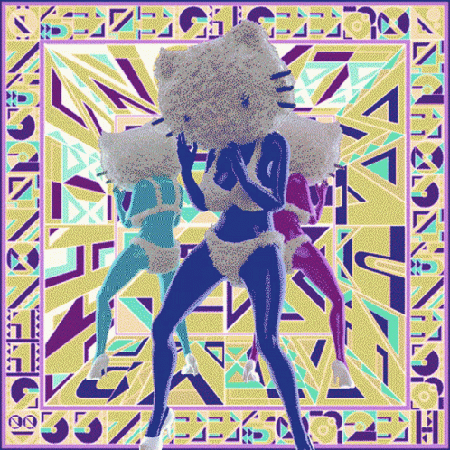 Three stylized figures with Hello Kitty heads dance against a vibrant, geometric background in this animated artwork by Vector Meldrew.