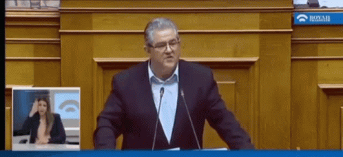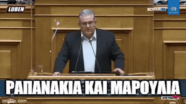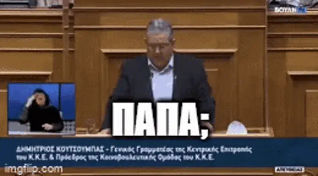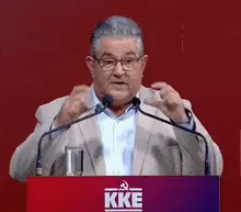 Dimitris Koutsoumpas of KKE delivers a speech with the on-screen text 'ΑΥΤΟΙ ΕΙΣΤΕ' (This is who you are).