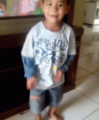 A young child in a white and blue shirt dances energetically, moving arms and legs.