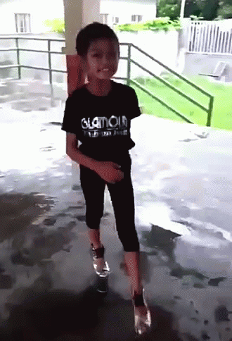 A young child playfully walks and poses in oversized glamour high heels, wearing a black t-shirt.