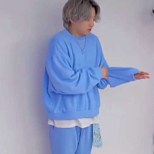 Jungkook of BTS, wearing a light blue oversized sweatshirt and matching sweatpants, posing playfully.