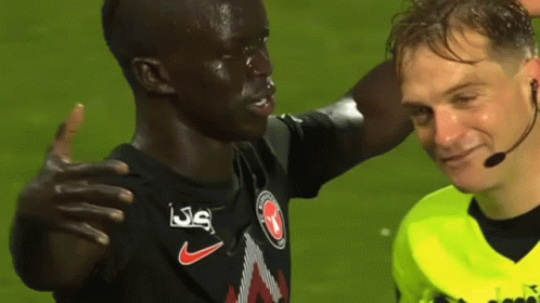 Referee Mikkel Redder shares a lighthearted moment with player Awer Mabil on the field during an Fc Midtjylland match.