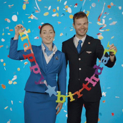 KLM cabin crew members, a stewardess and a steward, hold a 'Happy Birthday' banner amidst falling confetti.
