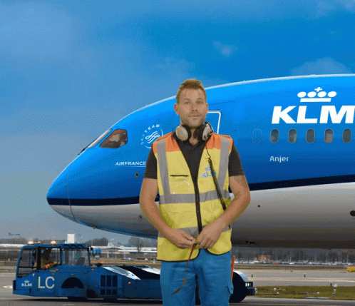 A KLM ground crew member in a yellow vest waves on the tarmac in front of a large KLM aircraft.