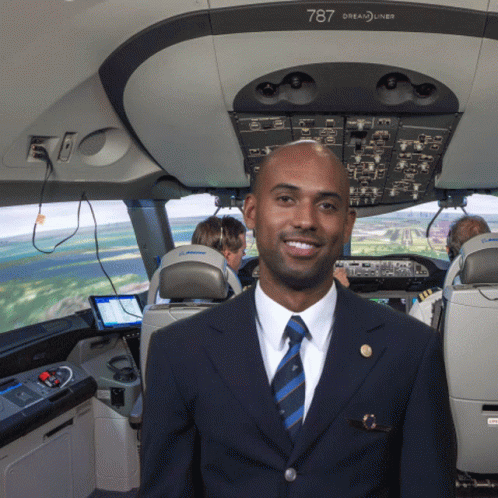 A KLM pilot in uniform smiles and waves from the cockpit of a 787 Dreamliner, performing a friendly greeting.