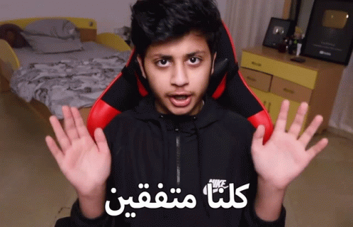 A young man in a black hoodie shows his hands up, with the Arabic caption "We all agree" displayed on screen.