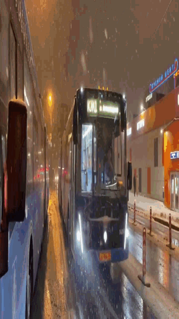 Two Moscow buses, KM1 and KM2, navigate a snowy street at night, with snow falling.