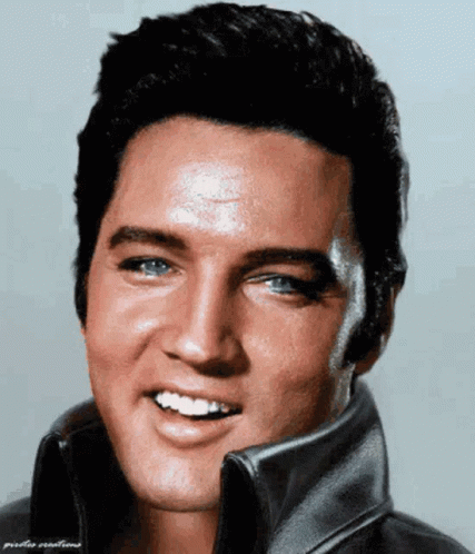 Elvis Presley winks at the camera, wearing a black jacket and showing his iconic smile.