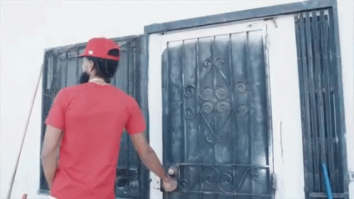 Nipsey Hussle, wearing a red shirt and red hat, opens a metal gate and door.