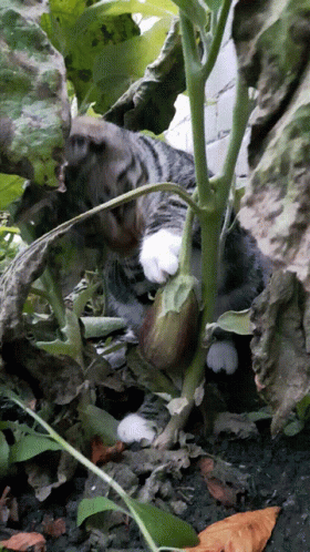 A tabby cat with white paws, affectionately called Ko Kobergine, playfully interacts with an eggplant plant.
