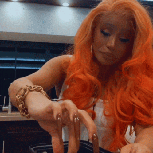 Cardi B, with vibrant orange hair and long nails, is seen mixing something in a black container.