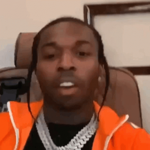 Pop Smoke looking at the camera, wearing an orange jacket and chains, in a private setting.
