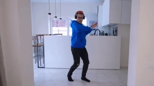 Кобяков from A4 YouTube channel dances energetically in a modern kitchen, wearing a blue hoodie and headphones.