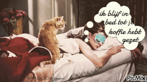 A woman sleeps in bed with her cat, who thinks "I'll stay in bed until you've made coffee."