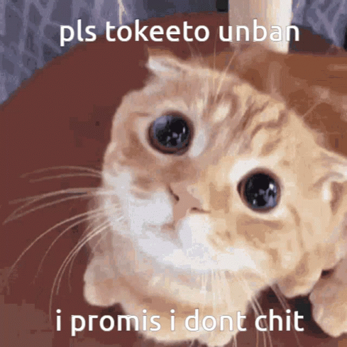 A cute cat with big eyes pleads 'pls tokeeto unban i promis i dont chit' in a humorous meme.