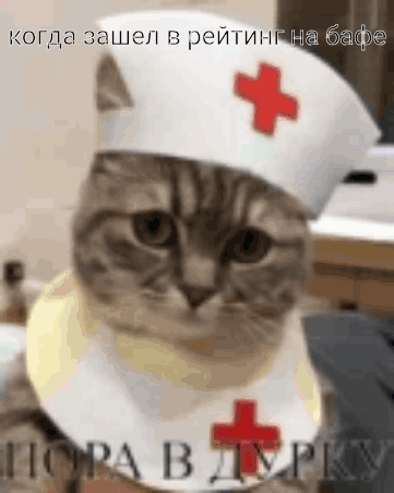 Sad cat in a nurse's hat, meme about entering a rating and needing to go to the asylum.