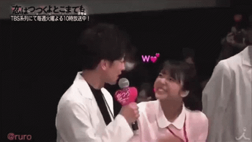 Takeru and Mone Kamishiraishi from Koi wa Tsuzuku yo Dokomademo share a sweet moment, with Takeru speaking into a mic.