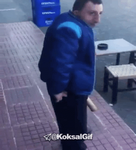 Koksal Baba holds a baseball bat, looking agitated on the sidewalk.
