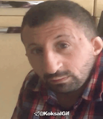 Koksalbaba, wearing a plaid shirt, looks at the camera then glances down.
