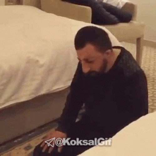 Koksalbaba kneels and prays for help, raising his hands in a heartfelt plea, with a Farsi caption on screen.