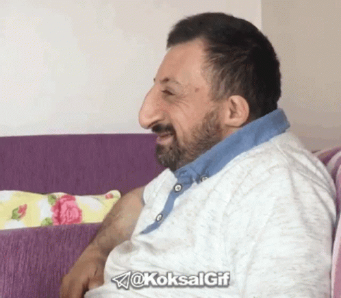 Koksal Baba sitting on a couch and picking his nose.