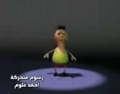 Animated character коля dances in a spotlight, with Arabic text 'Animated cartoons Ahmed Ulum' displayed.