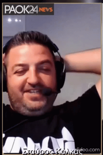 Stavros Kolkas from PAOK24 News celebrating, raising his hands with a big smile.